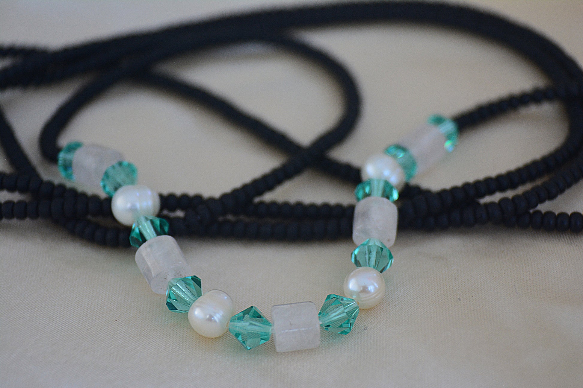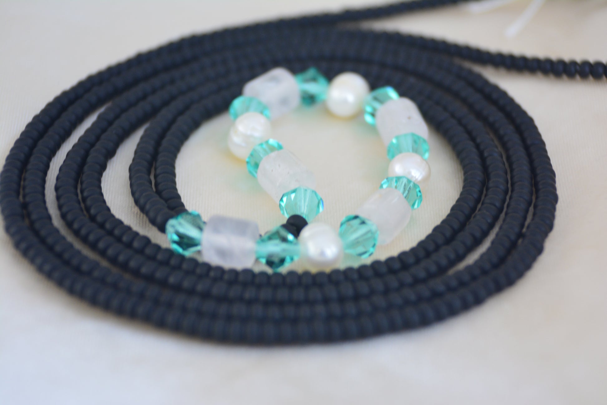 The Audrey features matte black glass beads, symbolizing elegance and sophistication, along with lustrous pearls that are often associated with purity and wisdom. Rose quartz is widely recognized as the stone of universal love. It is believed to open the heart to all types of love, including self-love, family love, friendship, and romantic love. Blue glass bicone beads add a unique touch, enhancing the overall aesthetic while contributing to a harmonious color palette. This design balances contemporary style with classic symbolism