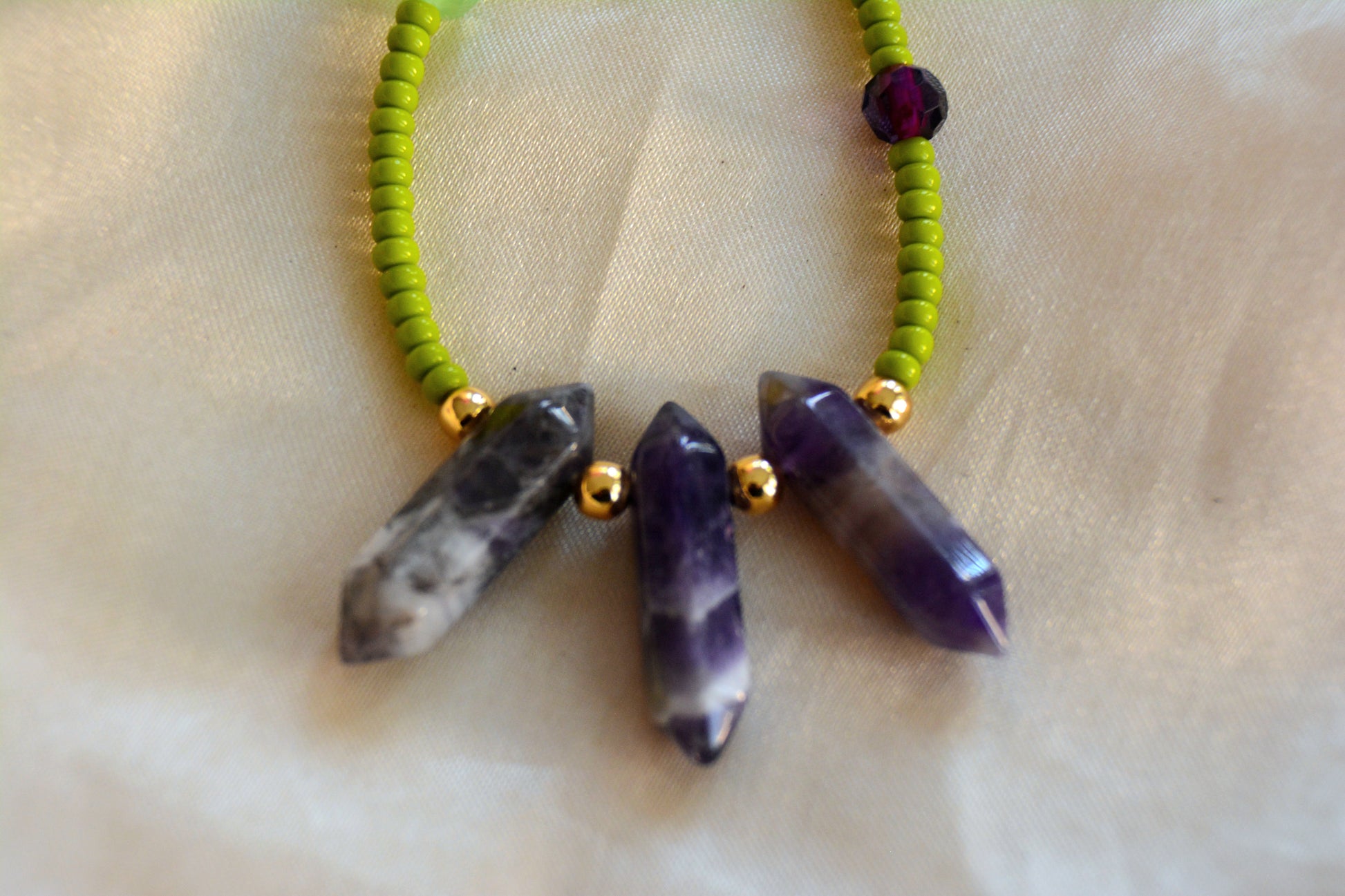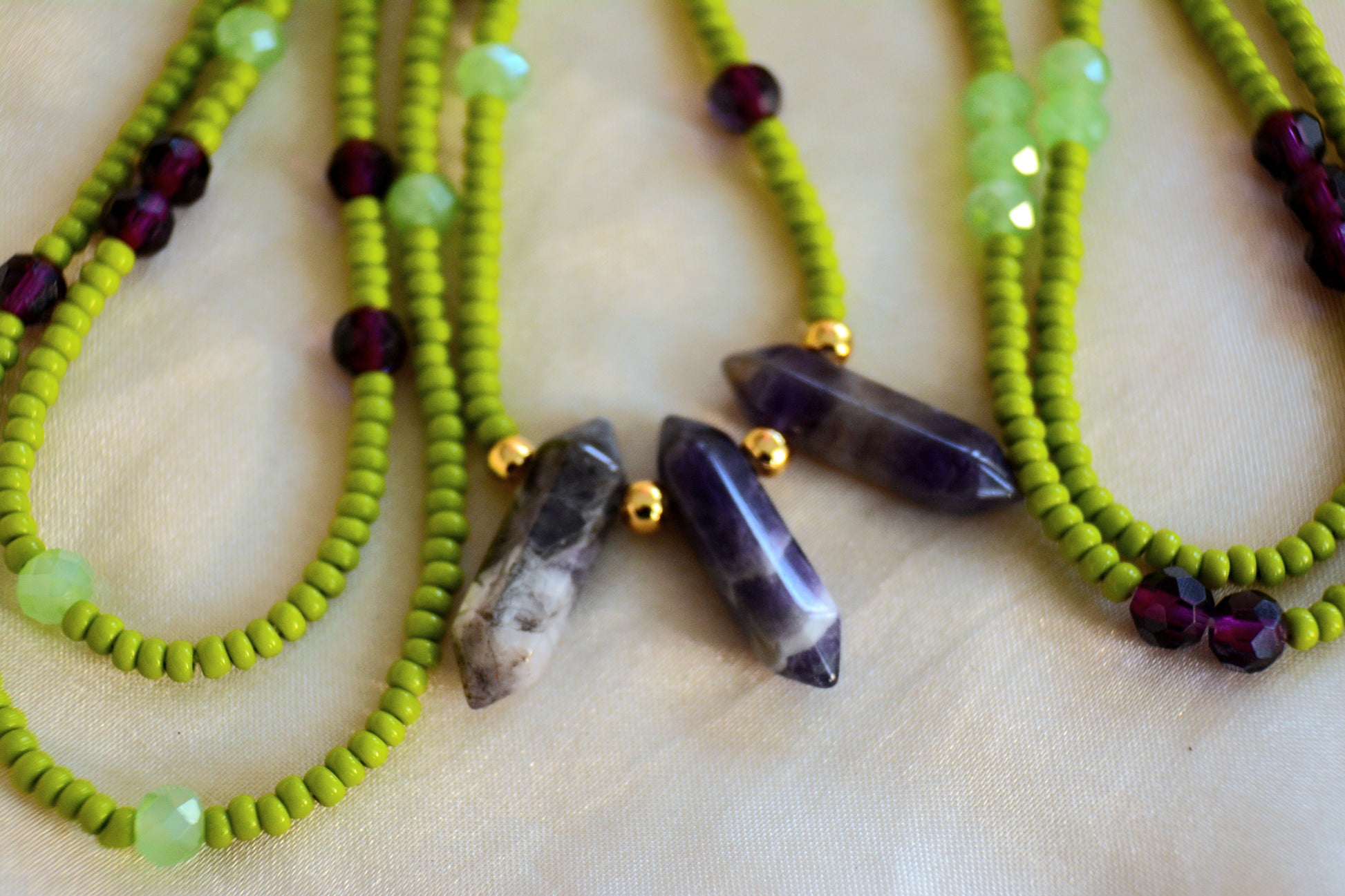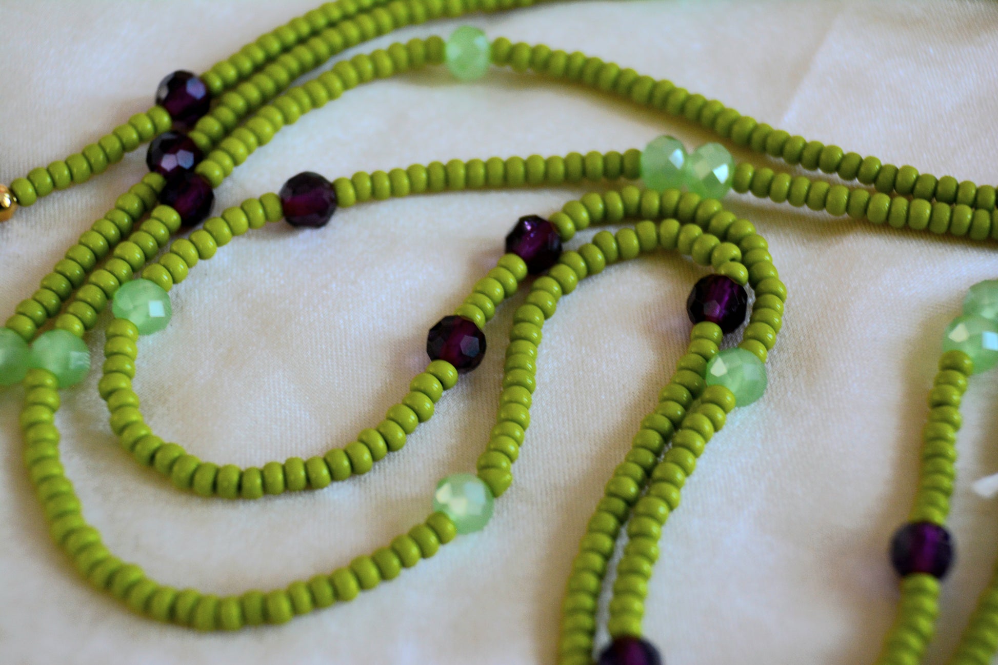 Introducing Aurora: Beautiful matcha green glass waist beads adorned with shimmering gold accents and enchanting amethyst crystals. The calming green color promotes harmony and balance, while the golden accents add a touch of elegance. Amethyst is known for its protective qualities, making this piece both stylish and meaningful. Perfect for elevating your everyday look!