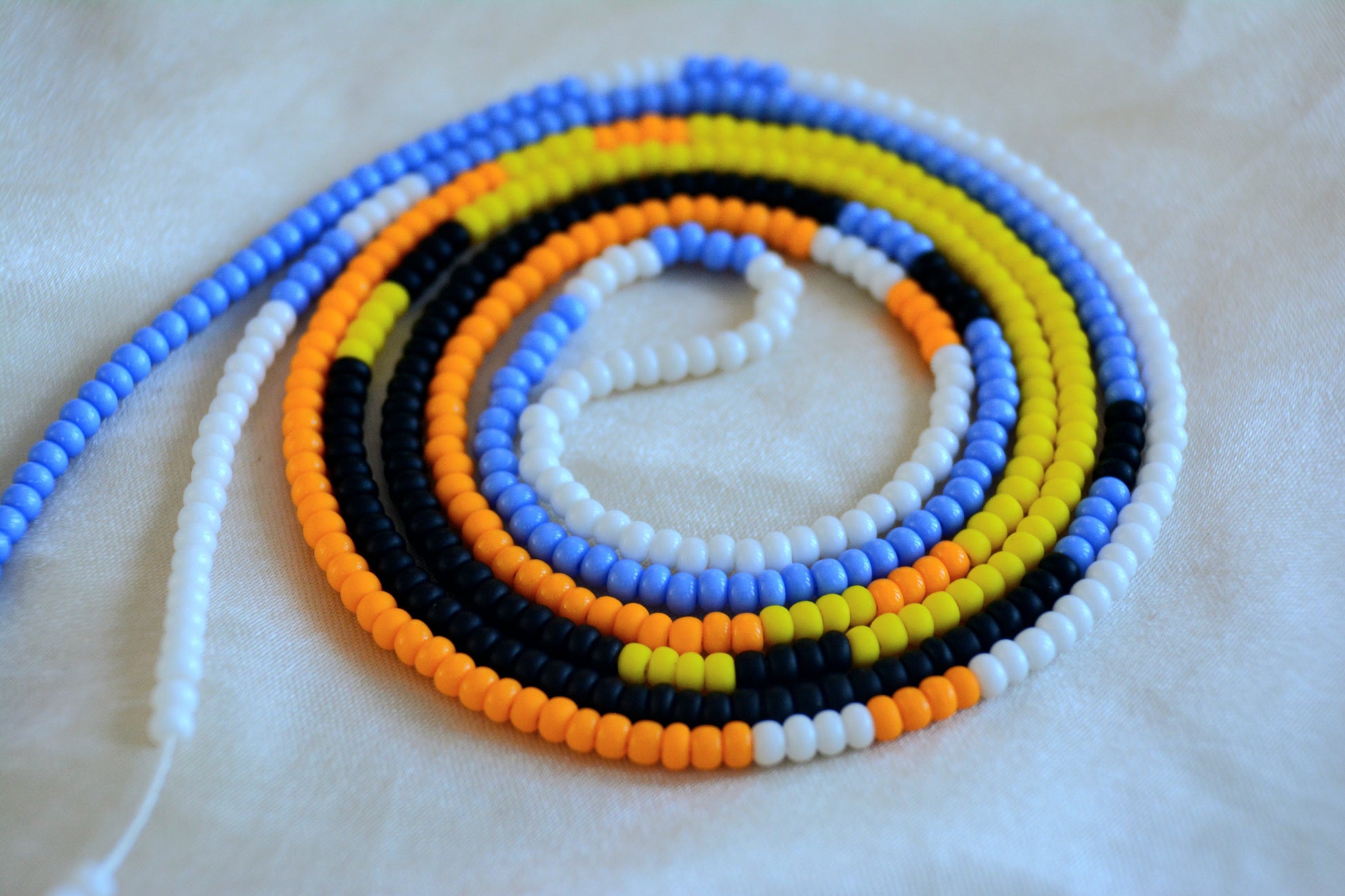 Discover the exquisite beauty of Noir, a stunning collection of hand-crafted waistbeads featuring vibrant orange, yellow, black, blue, and white glass. Each color tells a story: orange ignites enthusiasm, yellow radiates joy, black symbolizes strength, blue evokes tranquility, and white represents purity. Wear them as a powerful expression of your individuality!
